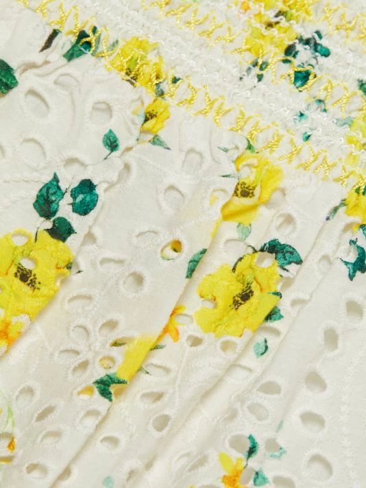 The Bethie miniskirt from Alice + Olivia features scalloped tiers of floral-print eyelet lace. A wide, smocked waistband completes this sunny look.