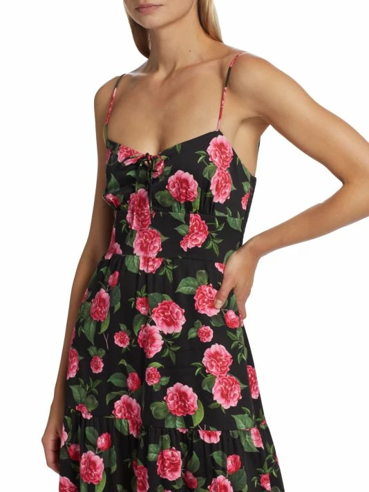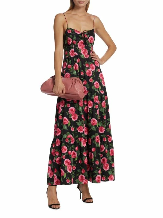Alice + Olivia’s Chantay maxi dress is designed with a floral print, a tiered skirt, and a tie-front neckline.
