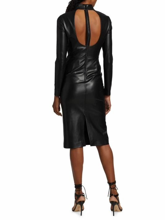 Crafted of faux leather, the Delora sheath dress from Alice + Olivia evokes an edgy aesthetic. This style highlights its sleek silhouette with a mock turtleneck and long sleeves.