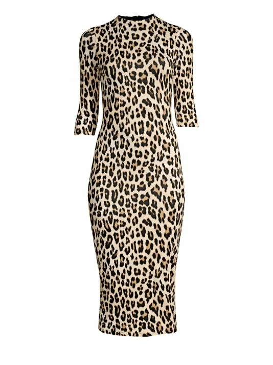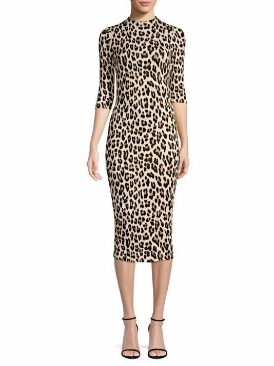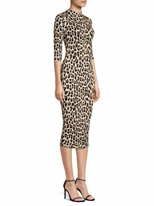This form-fitting midi dress is enhanced with an allover leopard print.