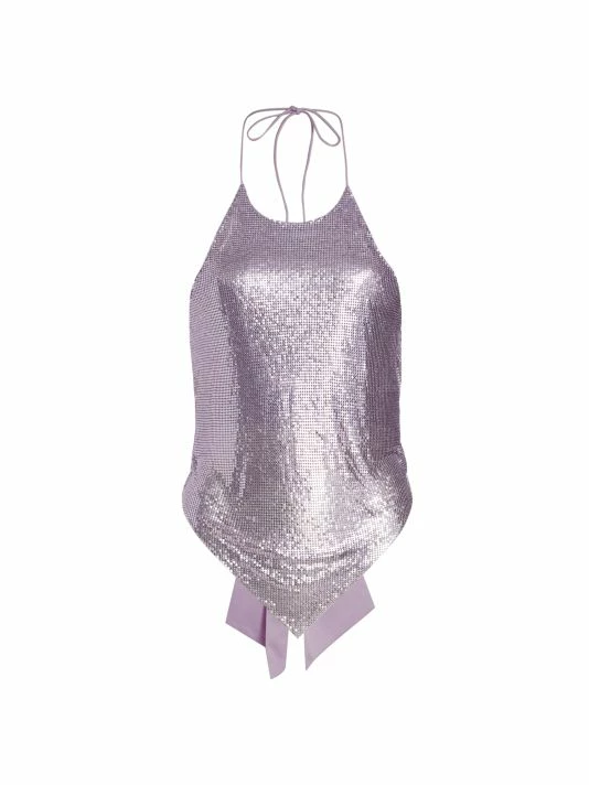 Designed with a handkerchief hem, Alice + Olivia’s Frenchie top is crafted of chain mesh. This piece is finished with a self-tie at the back.
