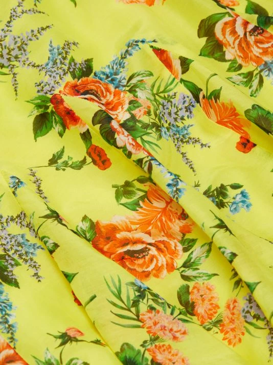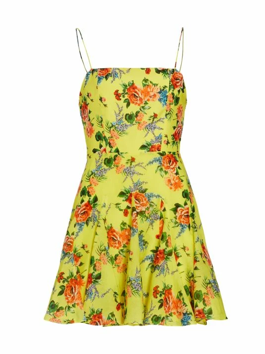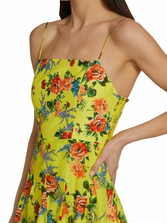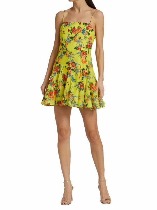 This chic minidress showcases a bright floral print, adorned with thin shoulder straps and flared hem.