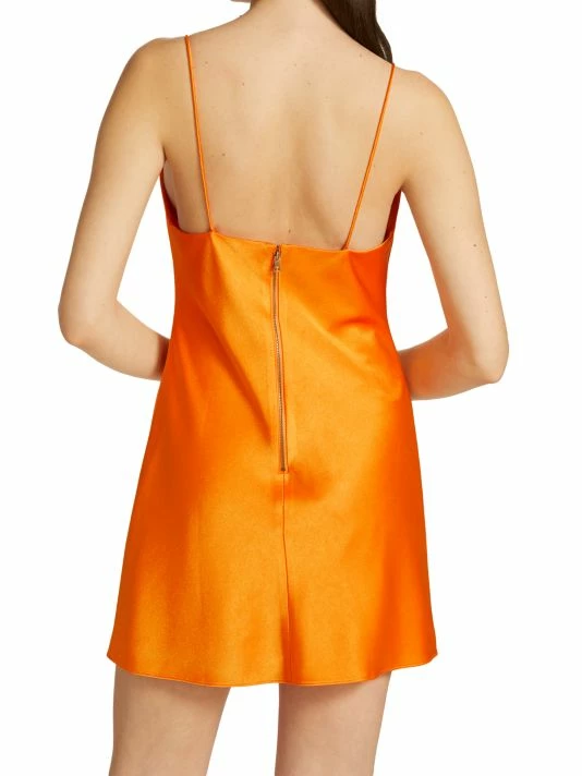 Crafted of satin, Alice + Olivia’s Harmony mini slipdress is styled with a cowl neck, spaghetti straps, and an exposed back zip.