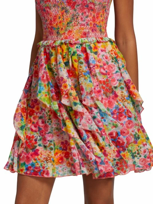 Boasting a colorful floral print, Alice + Olivia’s Jocelyn minidress features a smocked square-neck bodice with ruffled trim. An A-line skirt with flowing vertical ruffles completes this bright style.