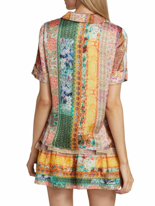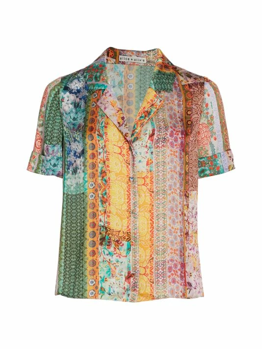 Decorated with vintage-inspired print, Alice + Olivia’s Kahlo button-front top is detailed with a notched collar and short sleeves.