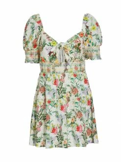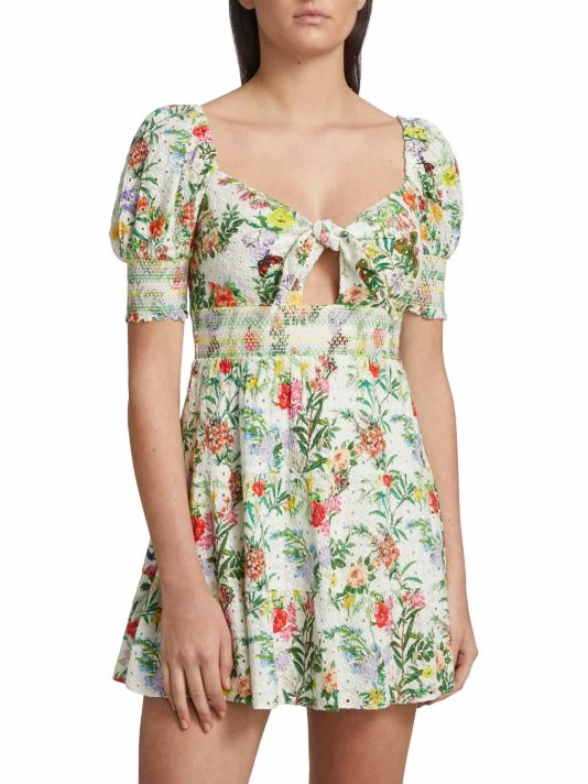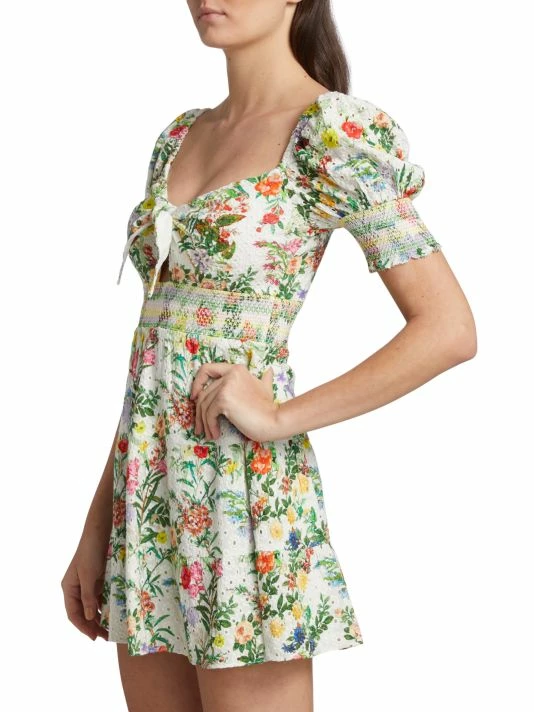 Embroidered with a floral motif, Alice + Olivia’s Kristie minidress is defined by a knotted bodice. This piece features intricate stitching at the waistline, and is finished with a silvertone back zip closure.