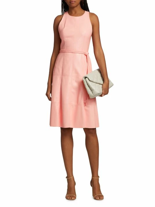 Crafted of vegan leather, Alice + Olivia’s Leandra midi dress is cinched with a long braided leather belt.