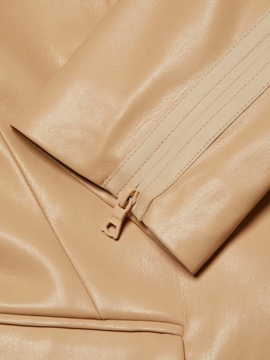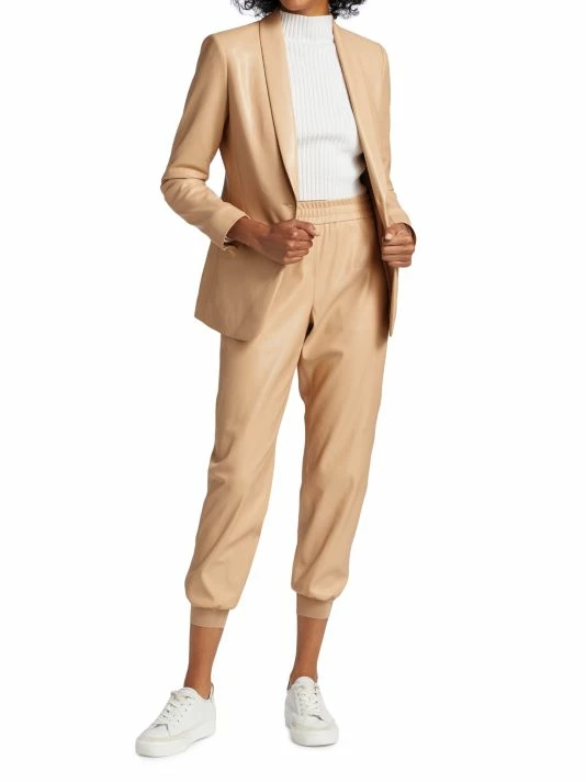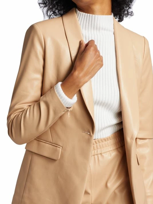 Tailored one-button jacket crafted of sleek faux leather, featuring flap pockets at hips.