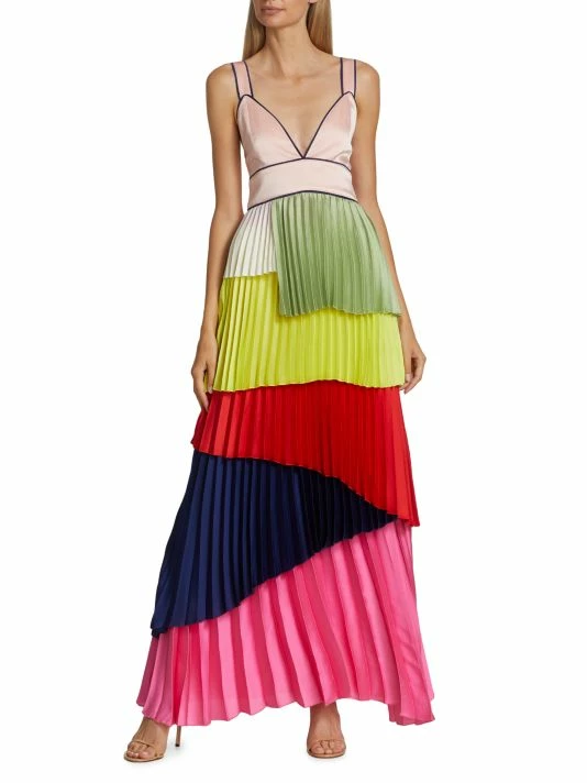 Layers of vibrant pleating lend style and dimension to Alice + Olivia’s Maisie maxi dress, designed with a fitted bodice.