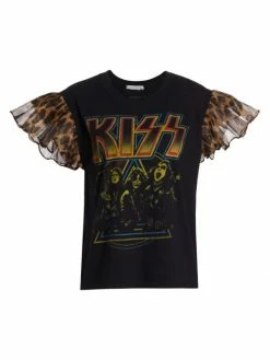 The Miller boyfriend tank from Alice + Olivia features a classic crewneck and a band graphic. Cheetah-print ruffled details at the shoulders add a feminine edge.