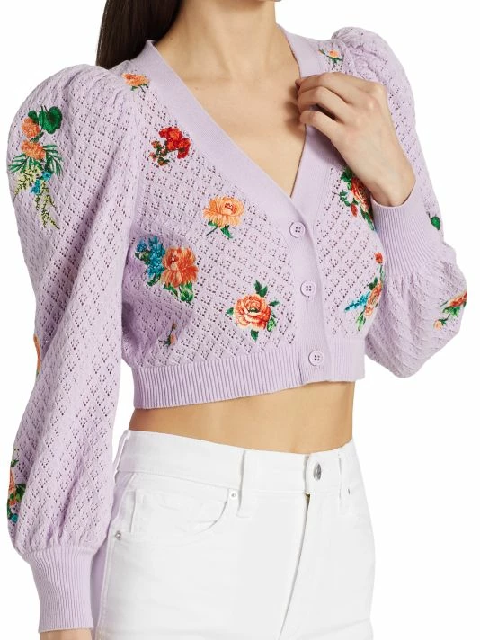 Alice + Olivia’s Morita cardigan features a cropped silhouette with voluminous puff sleeves. This pointelle style is embellished with bright, embroidered floral patches.