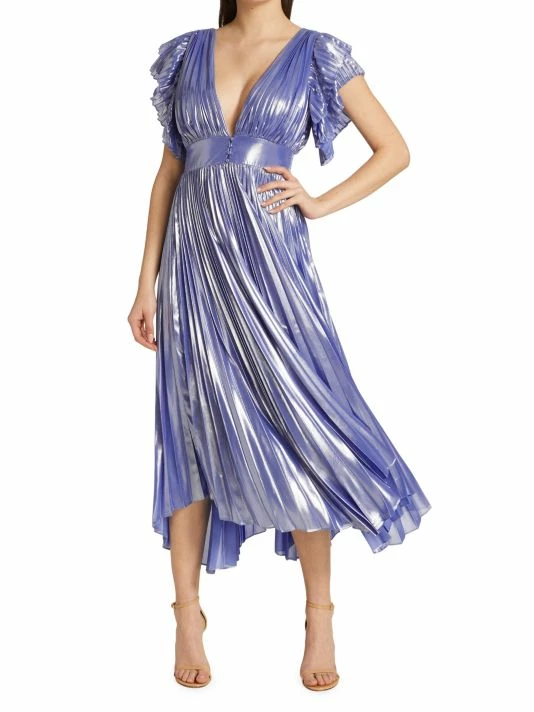 A glossy metallic finish updates this midi dress, designed with allover pleating for shape.