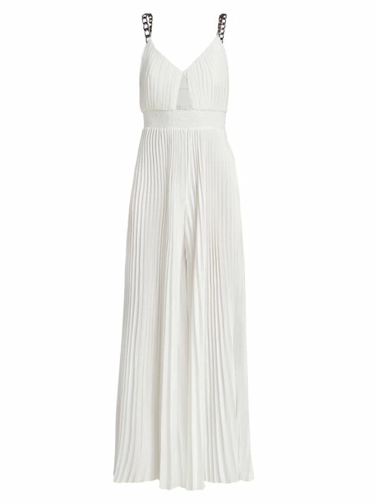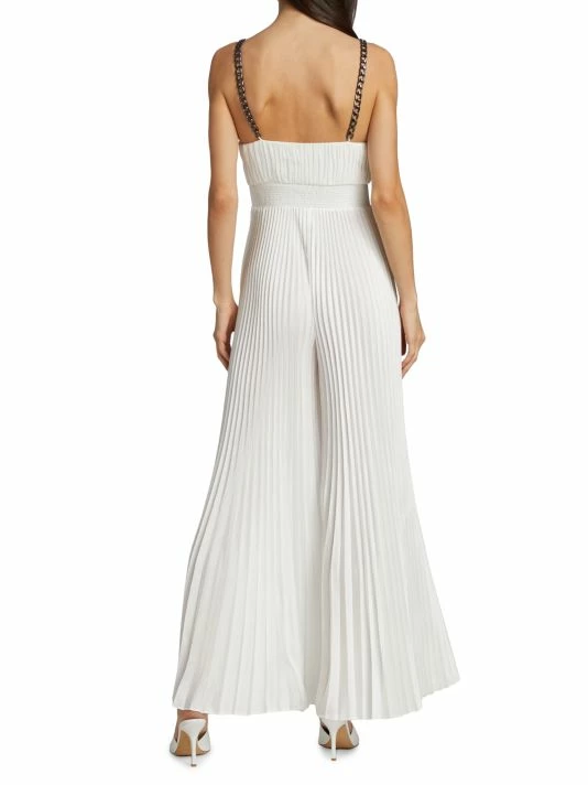 Anchored by chain straps, this stretch wide-leg jumpsuit features allover pleating for style and shape.