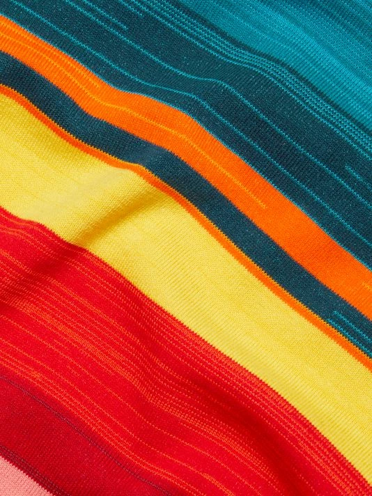 The Romi Cardigan from Alice + Olivia is adorned with puff sleeves and rainbow stripes.
