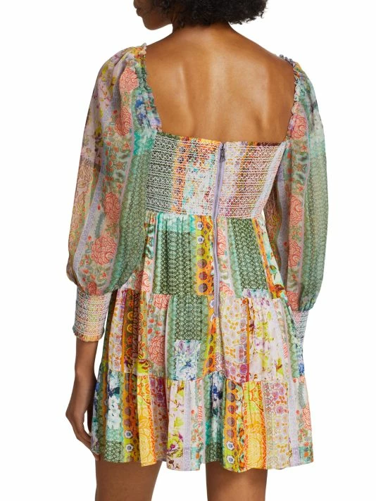 Alice + Olivia’s Rowan tunic dress features an empire-waist silhouette with a square neck and a tiered skirt. Long, semi-sheer blouson sleeves finish this bohemian style.