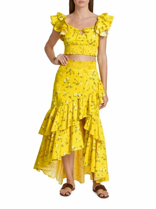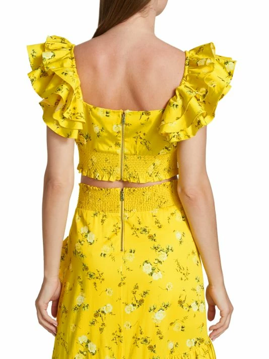 Crafted of cotton blend, Alice + Olivia’s Shanae floral-printed crop top is detailed with a square neck, ruffled cap sleeves, and a smocked hem.