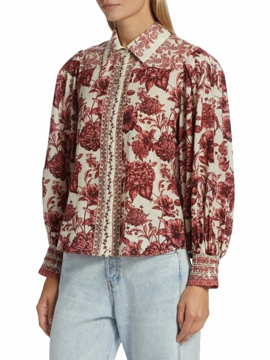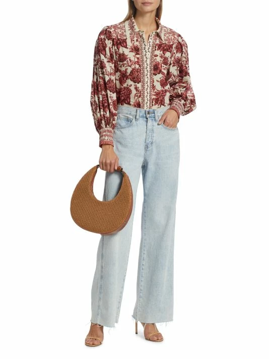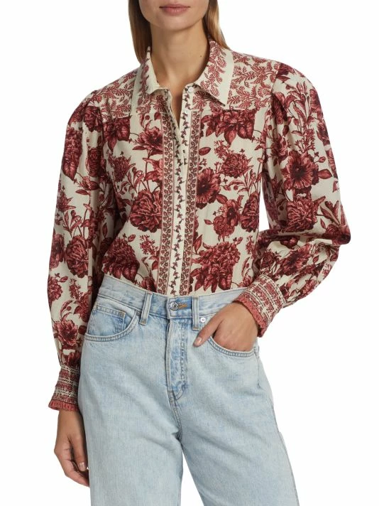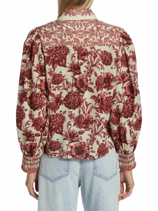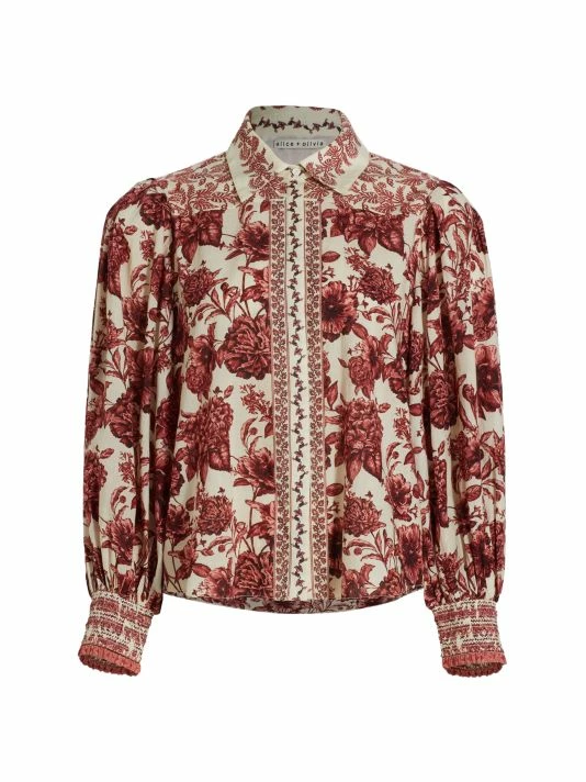 Alice + Olivia’s Tiffie blouse is adorned with an ornate floral print. This bishop-sleeve style is complete with smocked cuffs and a concealed button placket.