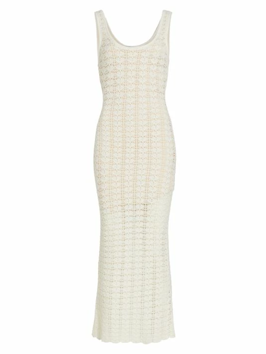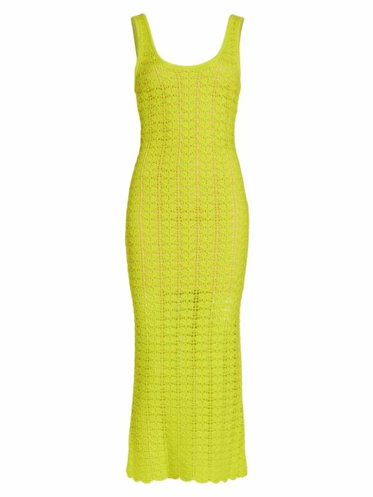 The form-fitting Veronique midi-dress from Alice + Olivia is crafted of a pointelle-style crochet and is styled with a scoopneck and see-through, scalloped hem.