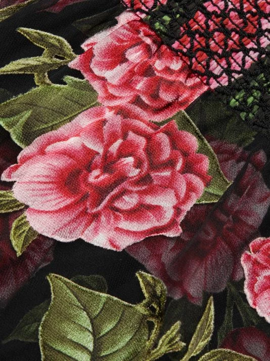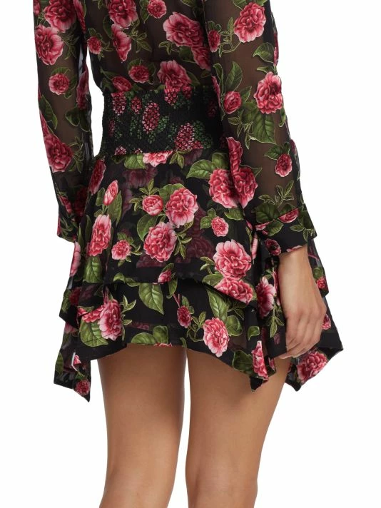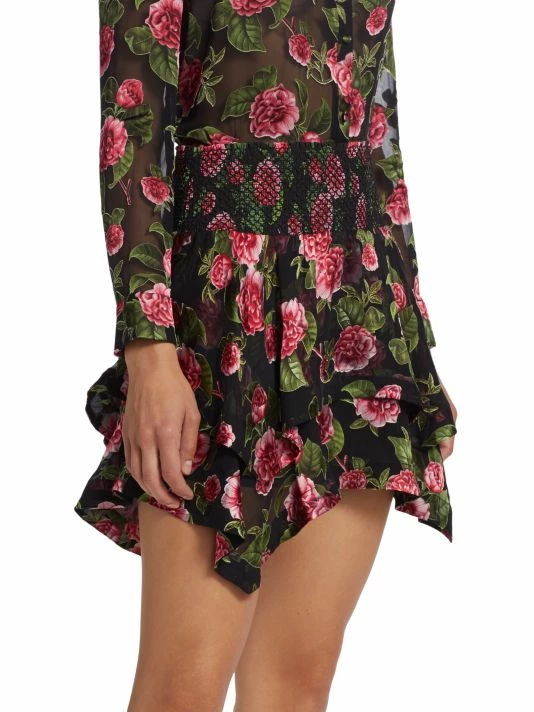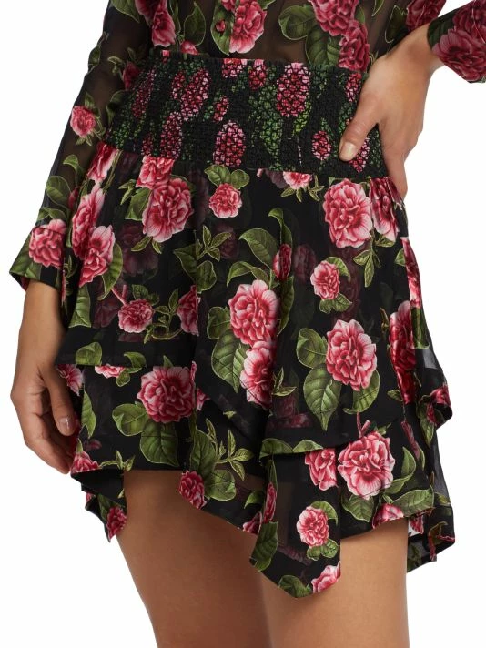 Crafted of a silk blend, Alice + Olivia’s Zarya miniskirt features smock detailing at the waist. This tiered style is adorned with a vibrant floral print.